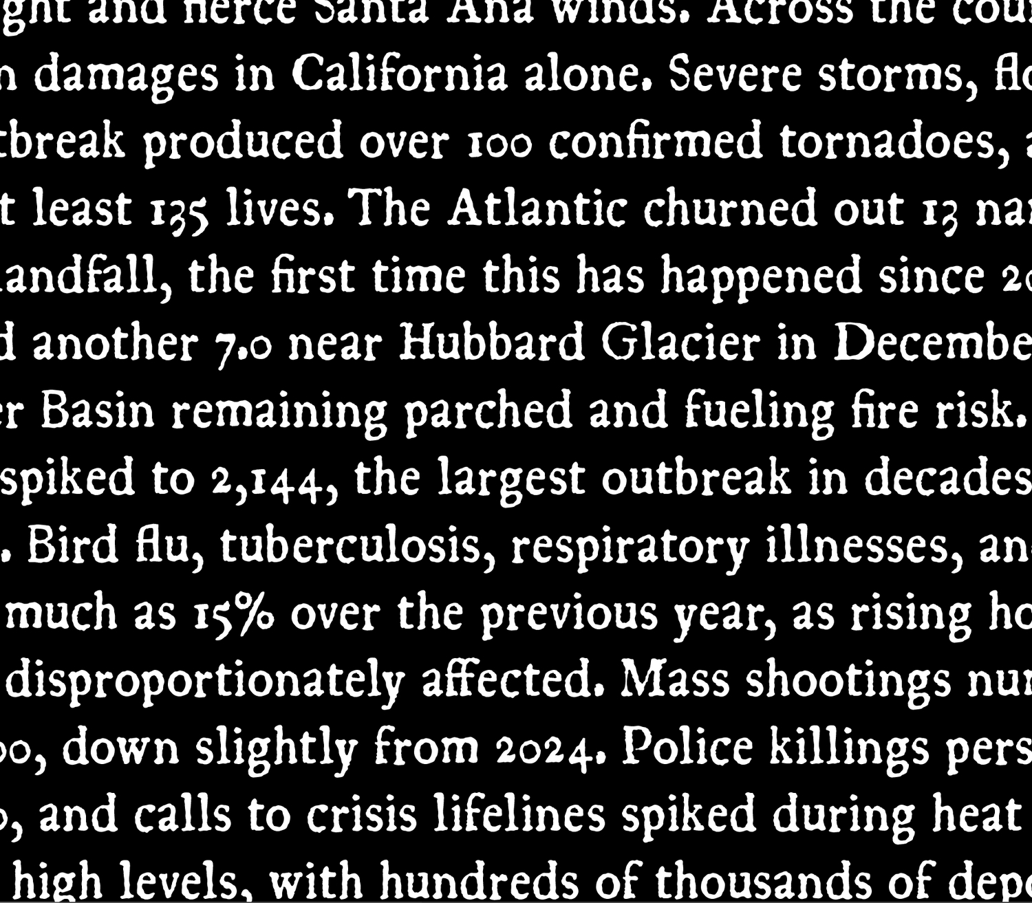 A wall of text reporting some of the natural disasters and calamaties that the US endured in 2025.